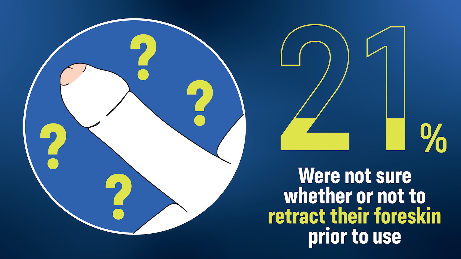 Apart from issues with fit and pleasure, of the 79% of people who’ve had difficulty using condoms with their foreskin, 21% were unsure whether or not to retract the foreskin prior to use. We’ve found that there is no definitive suggestion to make, as it comes down to personal pleasure. Whether you’re team up or team down, you’re sure to have a pleasurable experience if you use a properly fitting condom that enables your foreskin to move naturally, possibly with extra space and/or lubricant depending on your individual preferences.