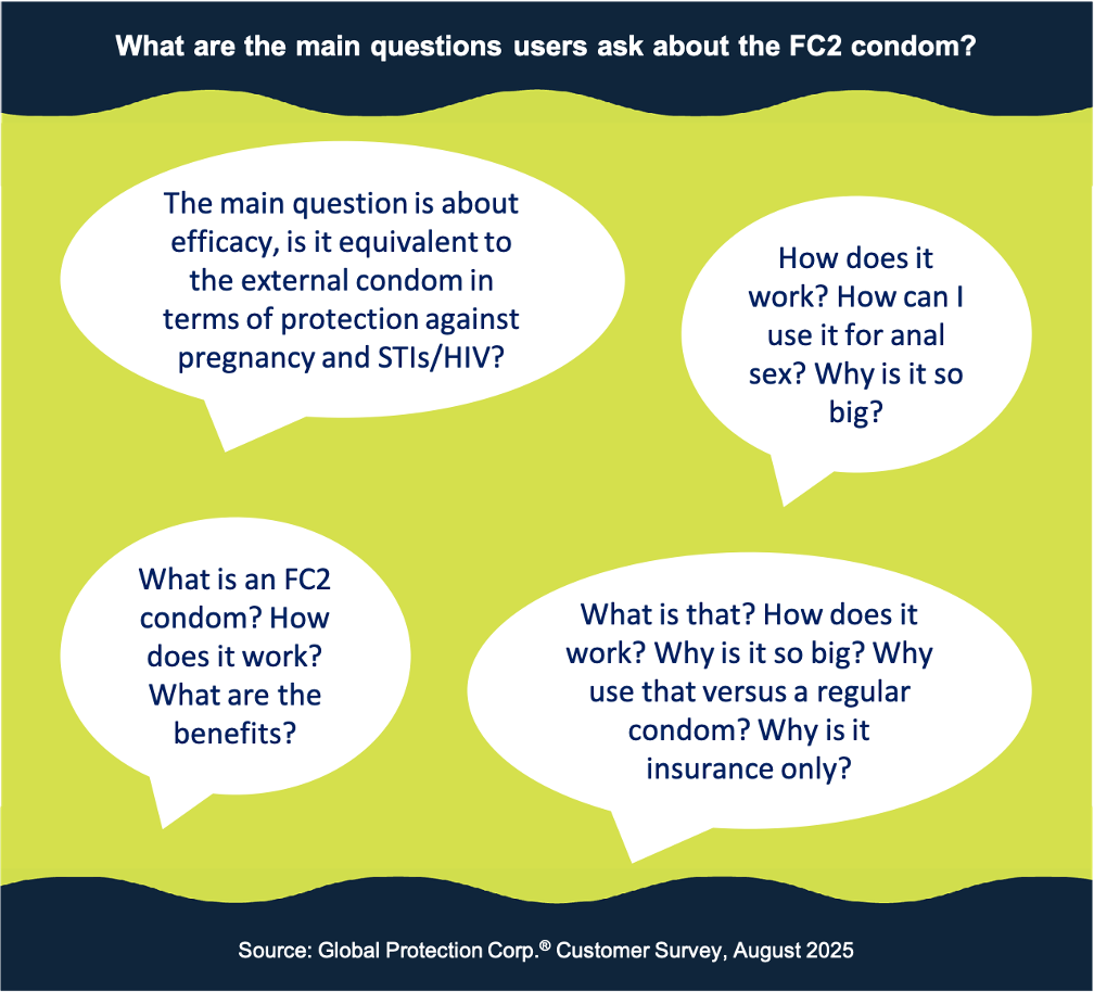 The customer survey we recently fielded reinforced much of the feedback we get – lack of awareness is the leading barrier to FC2 usage. We asked public health customers what questions they hear from users about FC2 internal condoms. The graphic below highlights survey comments that are representative of their responses. What is an FC2 condom? How does it work? What are its benefits? It’s evident that education needs to be at the forefront in order to facilitate adoption.