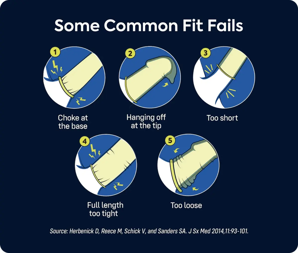 - Condom is too tight: Not enough condom width can lead to uncomfortable constriction, a painful tight ring at the base of the penis, and erection loss.
