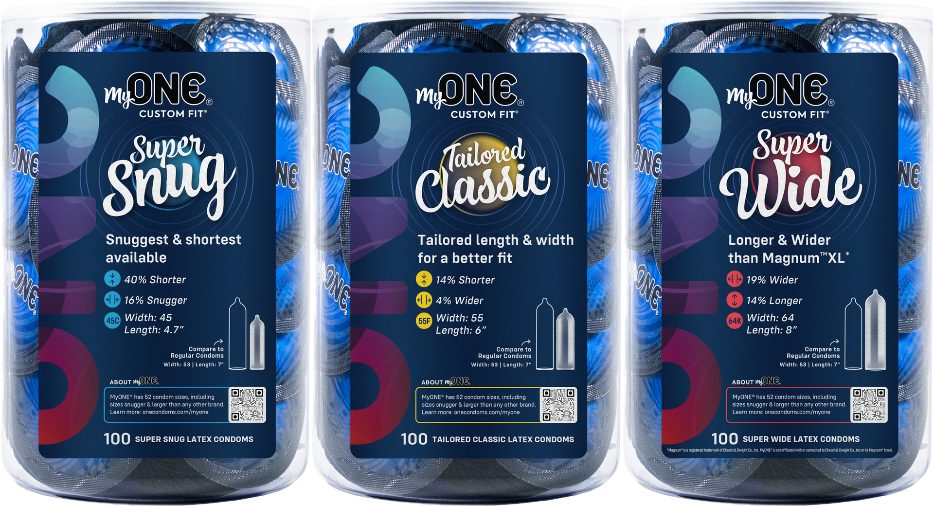 MyONE® Custom Fit® is a comprehensive solution for a perfect condom fit. MyONE® has 10 length options and 9 girth options for a total of 52 custom size combinations. This includes sizes snugger and larger than any other condom brand. The 10 length options range from 4.7 to 9.3 inches, and the 9 girth options range from Super Snug to Super Wide (45mm to 64mm nominal width).