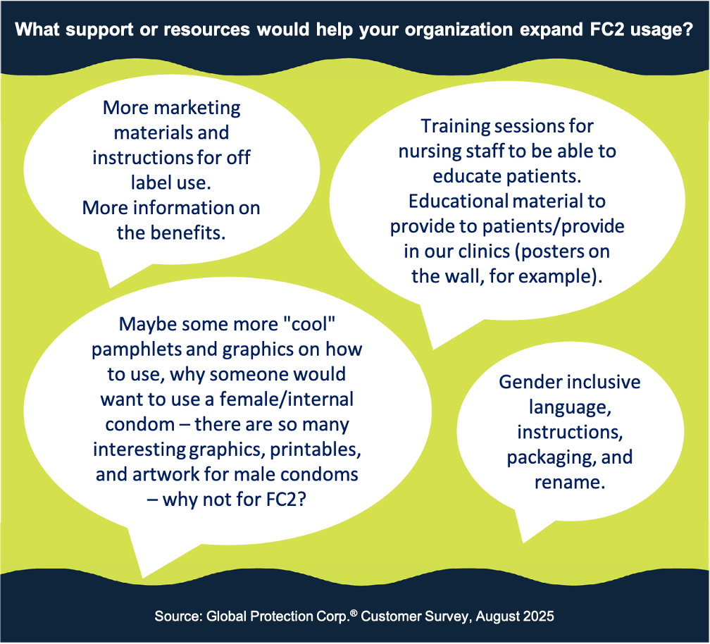 To combat the awareness and familiarity challenge, public health customers are hungry for more tools and resources. We included a survey question about what would help their organizations expand FC2 usage in order to better assess their needs. The graphic below highlights a sampling of the feedback we received. In line with the current assortment of education materials we offer, they indicate similar FC2 pamphlets and posters would be beneficial in supporting their advocacy efforts.