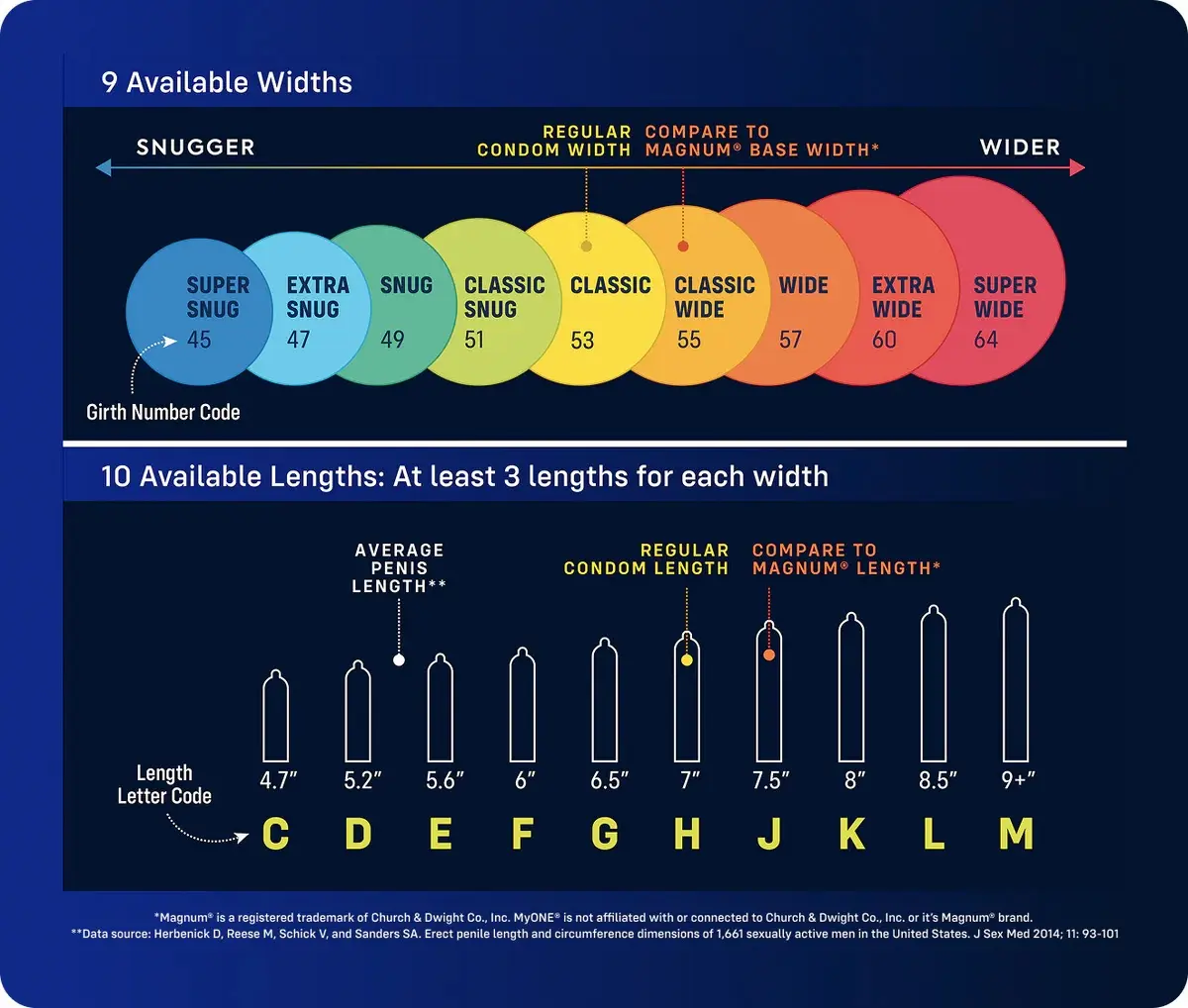 MyONE® Custom Fit® is a comprehensive solution for a perfect condom fit. MyONE® has 10 length options and 9 girth options for a total of 52 custom size combinations. This includes sizes snugger and larger than any other condom brand. The 10 length options range from 4.7 to 9.3 inches, and the 9 girth options range from Super Snug to Super Wide (45mm to 64mm nominal width).