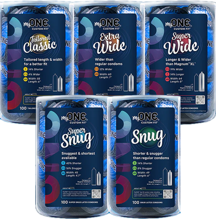To better support your efforts, we now offer MyONE® Custom Fit® bowls of 100 condoms in five size options: Super Snug, Snug, Tailored Classic, Extra Wide, and Super Wide.