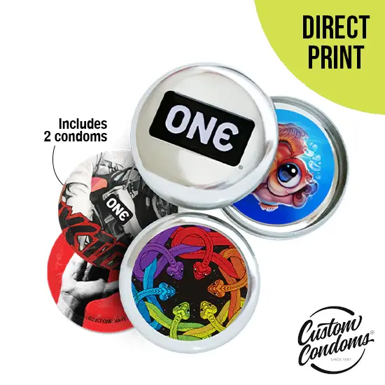 Your logo or artwork goes on one side on the outside, while the other side features a ONE® logo. Each tin comes with two of our round ONE® Condoms featuring a variety of cheeky designs, condom use instructions, and a ONE® branding insert.